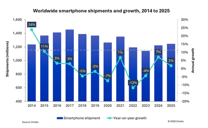 值得一提的是,Omdia表示虽然2025年全球手机出货量同比增长2%,达到12.5亿部,创下了自2021年以来的最高年度水平,但2026年市场萎缩不可避免,而手机品牌预计会将盈利能力放于首位。