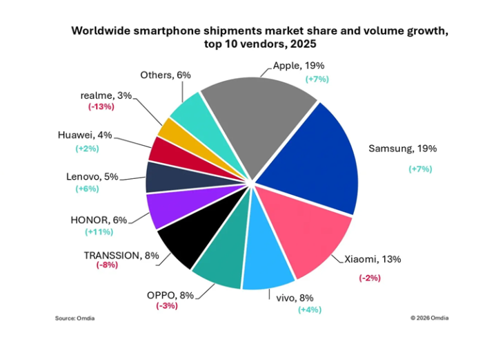 根据Omdia公布的数据来看,2025年全球前五的手机品牌排名以及份额与IDC几乎保持一致:苹果以19%份额排名第一,三星19%排名第二,小米13%排名第三,vivo与OPPO则都是8%,分别排名第四、第五。